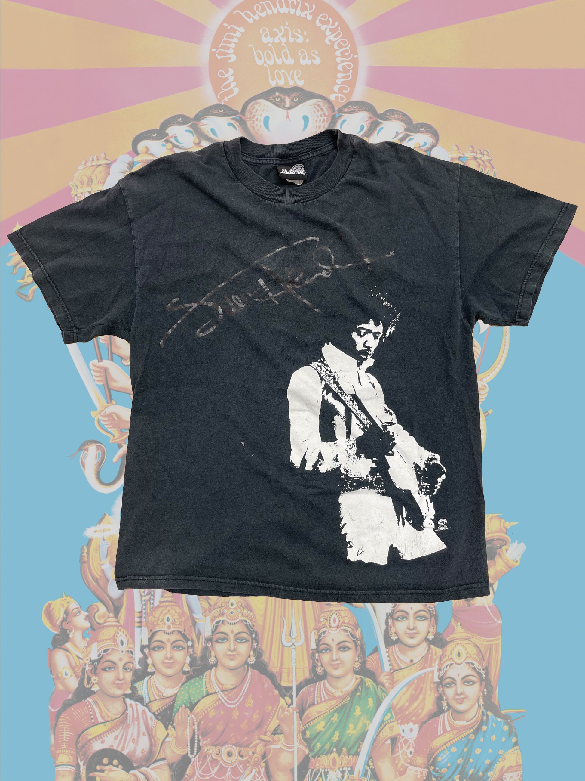 Authentic Jimi Hendrix Guitar Stance 2005 T-Shirt. Tone on tone Jimi’s signature and iconic pose oversize front print. Black shine signature print.